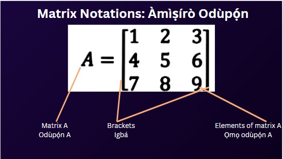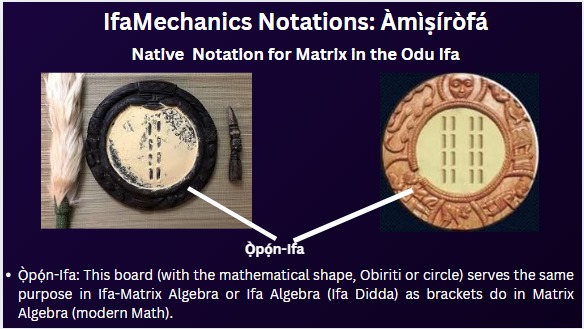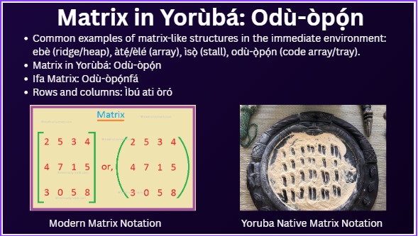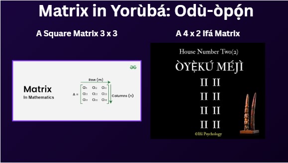 A matrix is a rectangular array of numbers, symbols, or expressions arranged in rows and columns. The picture below shows the modern matrix notation compared with the ancient Yoruba native matrix notation called Odu-opon.