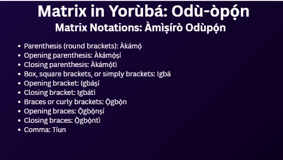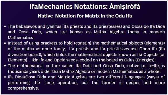 What we call matrix algebra or matrix theory in modern mathematics has its roots in the ancient mathematical tradition of Ifa Dida or Oosa Dida in Yoruba culture.